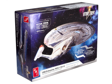 Molded in high‑quality plastic with crisp panel lines, the Enterprise features a detailed saucer section, warp nacelles, deflector dish, and display stand for an impressive, finished presentation. Builders will appreciate the clean fit, classic AMT engineering, and included decal sheet that recreates the ship’s registry markings and hull graphics.